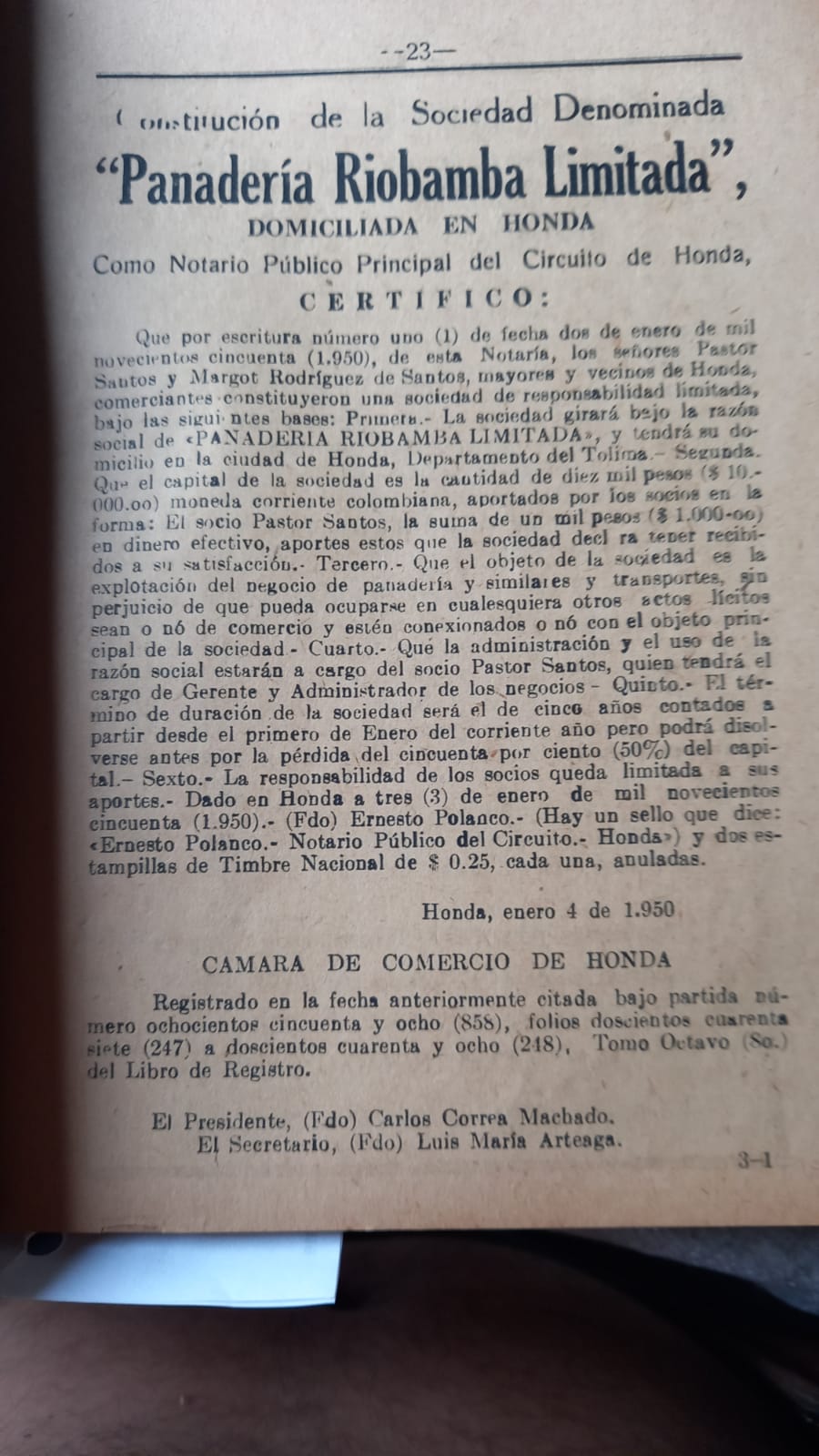 1950. Según escritura No 01 del 2 de enero, se constituye la sociedad denominada "Panadería Riobamba Limitada", cuyos socios son, Pastor Santos y Marina Rodriguez de Santos , con un capital de $ 10.000.00 (Diez Mil pesos mcte)